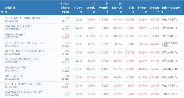 Similarly, it is the mainly the overseas commercial REITs that took the top spots in the list, falling from -24.6% to a disastrous -89.3%.  Seems like these REITs have not recovered at all post covid.